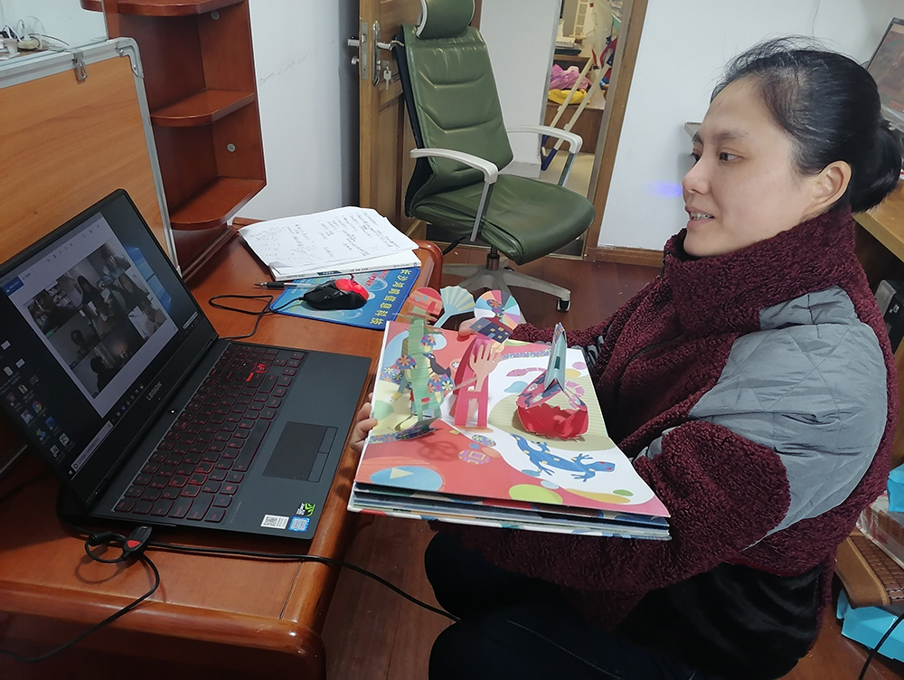袁老师在讲解书籍的材质与相关制作工艺时,通过运用自制的立体书籍,将抽象的知识与复杂环节拆分成系列的知识点,清晰、充分地讲解了专业知识,使员工们充分地掌握了课程单元的重点与难点,教学效果很好。在书籍设计的教学过程中,老师首先根据教学大纲的要求传授理论知识与实践要点,然后让员工结合优秀的线上资源与素材完成实训作业,在作业讲评时通过腾讯直播共享屏幕,员工们分成五组互评作业,其中五位组长作为发言人通过员工屏幕以PPT形式讲评了书籍内页设计等作业。通过互评同学们能发现自身设计作业中的不足,及时看到他人作业中的亮点并得到启发,并且更好地掌握了实践环节中的关键知识。