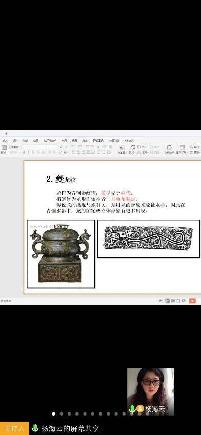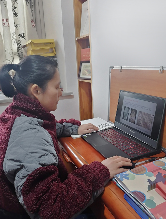 因为是网络授课,一切仿佛都在云端,对于杨海云老师来讲,这种教学方式是比较陌生的。但为了更好的完成教学任务,缩短与同学之间的空中距离,保障课程教学的有效进行,杨老师做了充分的准备。“首先,我硬着头皮积极学习各种网上授课技能,迎接新技术带来的挑战;其次,考虑到专业课程的特殊性,我制定了详细的授课计划,目标明确,每周、每天、每节课都做了详尽的规划与安排。” 通过前期实践与调整,杨海云老师摸索出来一套自己的教学方法,既综合利用各大网络平台的优势,采用平台课程资源课前预习+腾讯会议直播授课+课后发布教学PPT+QQ群辅导答疑的教学模式。在直播教学过程中,杨老师说她时刻注意把握上课的节奏及语调语速,增加了讨论环节,例如在《民间美术解析》这门课程中,讲到民间美术分类这一章节的知识点时,提问大家家乡有哪些民间美术及非物质文化遗产,结果同学们一下热情高涨,从家乡的民间美术讨论到各自的民族特色,引导关注优秀传统文化的传承问题,传统文化元素与现代设计的关系问题。另外,针对有些同学在家学习,电脑工具材料不齐全的问题,杨老师充分听取同学们的建议,在实践任务的安排上也做了相应调整,由易到难,循序渐进。”