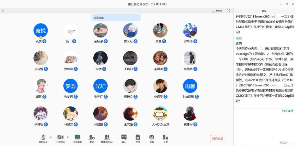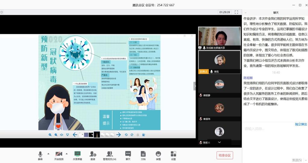 袁悦老师运用腾讯会议直播讲课,结合智慧树在线教育平台《书籍装帧设计》优质课程与本课程QQ群课前预习、课后复习与答疑,通过QQ群发送电子教材与相关学习资源,采用微信的群打卡进行考勤,顺利地开展了《书籍设计与印刷工艺》的线上教学。
