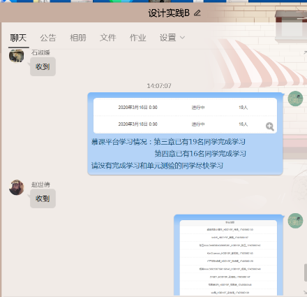 黄老师采用了中国大学慕课做线下(公司课表外时间)观看课程的资源与作业的布置,在每次课前更新;课程的在线学习时间(公司课表时间)采用腾讯课堂直播的形式,老师讲课与员工在线交流、打卡、记录学习状况;提交作业的方式为发老师的QQ邮箱。
