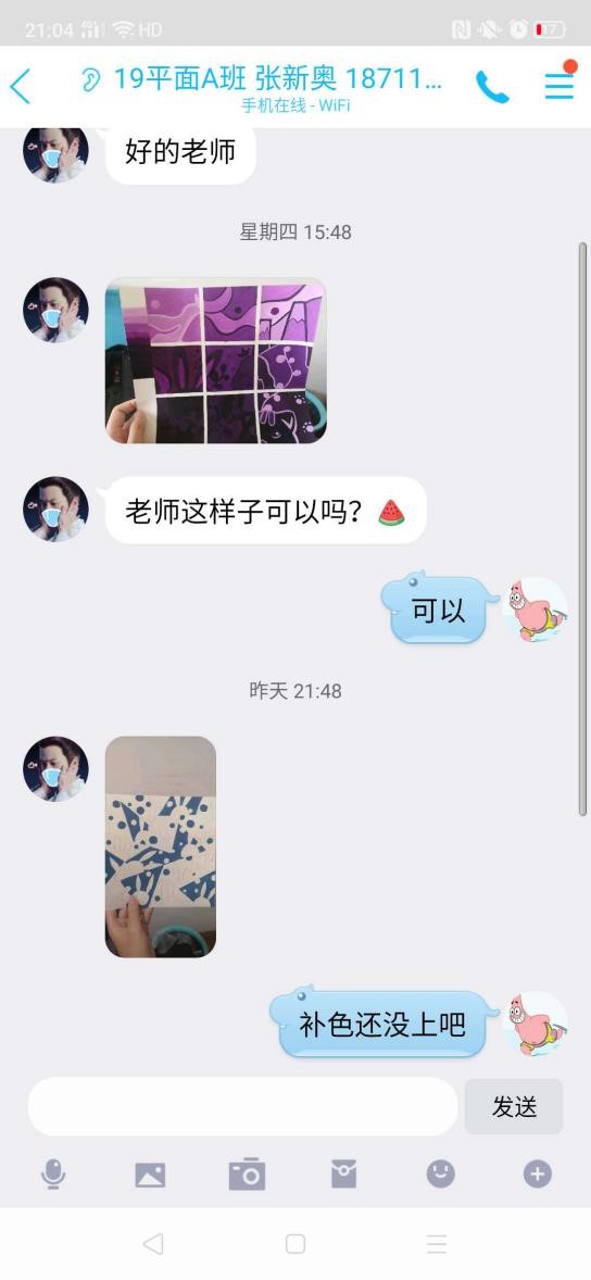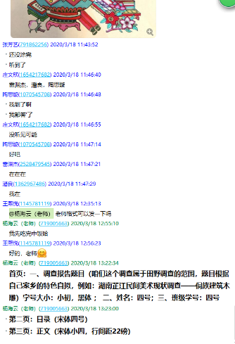 叶老师采用慕课平台《中国传统动画造型与民间美术鉴赏》优质课程,配合QQ群课程直播,QQ群资料预习、课后复习、发送相关阅读资料、课后答疑。在多种方式的课堂中,同学们可以比较轻松以及高效的对这门课程进行学习。技术手段的介入不仅打破了知识传播的时间、空间限制,也为思想的交锋与融汇提供了更充分的机会。在两周的教学中,叶老师在教学中将整理课程重点难点制作成PDF文件给到同学们提前学习以及课后复习,也通过QQ群为员工提供了不少阅读材料,并适当压缩了作业量,同时寻找网络资源,特别是视频资源,也尽可能自制视频资源,希望能增强在线课堂的吸引力。
