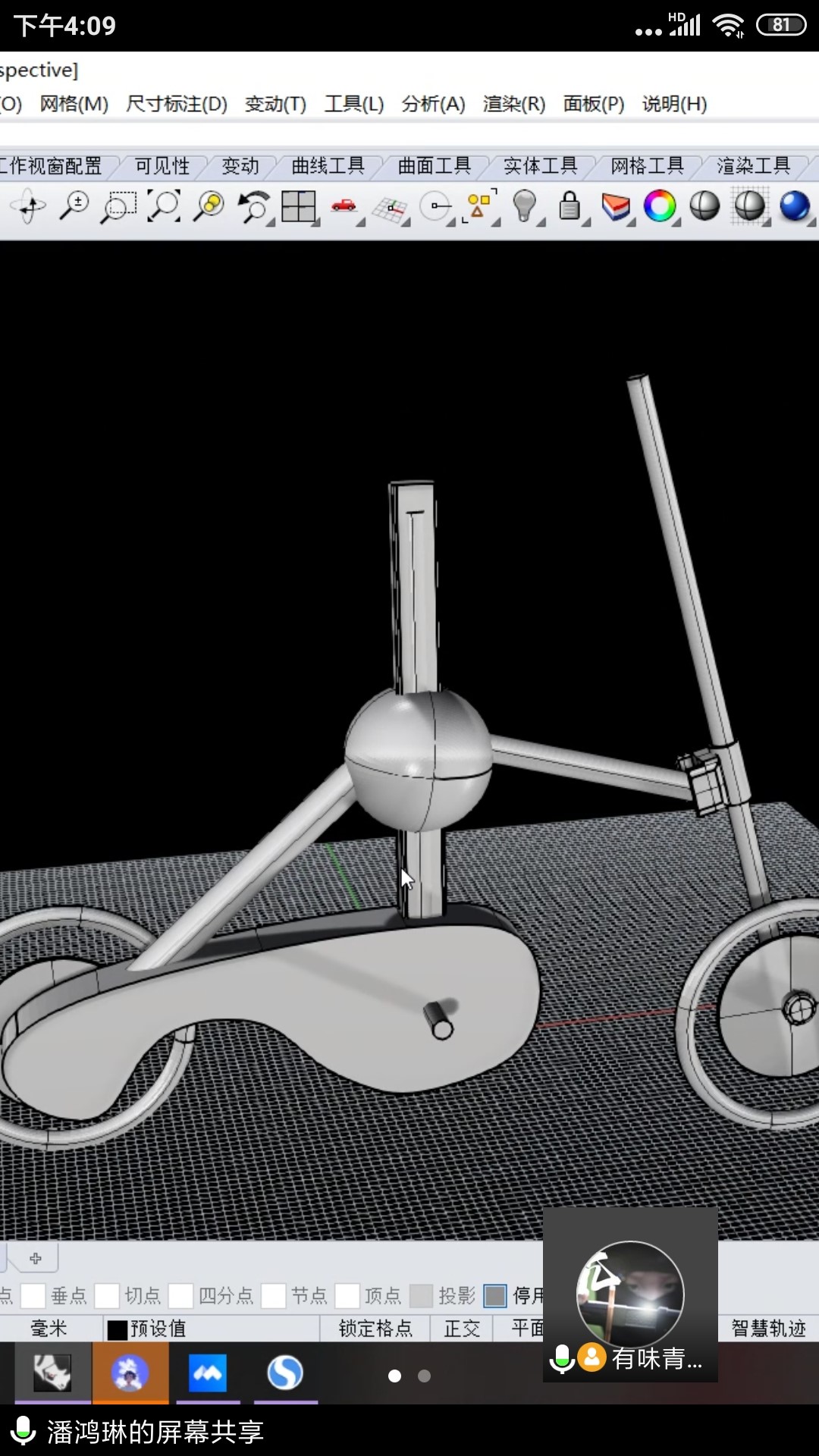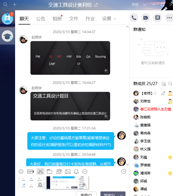 《交通工具设计》课是产品设计专业大三的专业课,既包含了理论教学,又十分注重设计实践操作和师生的互动,如何解决设计方案指导的问题是横亘在师生间交流的一大难题。这件平时在教室里通过一张纸和一支笔就能轻松完成的工作,却因为空间隔离变得十分困难。为了保障沟通顺畅,找到师生双方都能共享的“纸和笔”,经过多次对各方平台软件的调试,和师生学前交流测试,谢老师找到了一套行之有效的组合方法。