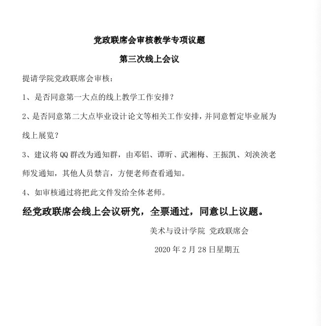 2020年2月15日至3月6日,WilliamHill中文官网分别在线上召开四次教学专项党政联席会议,审议教学负责人提交了《WilliamHill中文官网疫情防控期间在线教学与组织管理工作方案》、《WilliamHill中文官网教师线上教学实施与课程建设一览表》、《WilliamHill中文官网线上教学督导计划》等文件,明确“以课程组为单位,教学方式灵活多样,平台选择以简单易操作,保障教学为主”的工作思路。审定了全院教师、所有课程的线上教学初步计划,选用平台情况等。要求课程组内统一教学方式,课程组负责人负责填报实施情况,相同课程同平台上课,同头课教团队源互享,协同工作模式。确定了开学前试课工作安排;线上教学督导方案;教学材料要求;毕业论文实施方法;毕业作品展的调整等。从宏观到微观,层层细化,逐步落实了公司线上教学的具体工作,为公司线上教学的顺利实施奠定了基础。