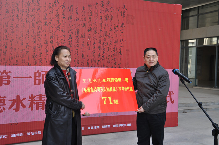 王德水先生在讲话中表达了对威廉希尔WilliamHill在一代伟人毛泽东同志诞辰120周年暨公司建校110年之际,让自己在主席曾求学过的公司举办个人书画展的诚挚谢意,使自己表达了对一代伟人的无限敬仰之情。王德水希望这种文化的交流与合作能进一步地延续与发展,使一师的校园文化的艺术氛围得到更大地提高。