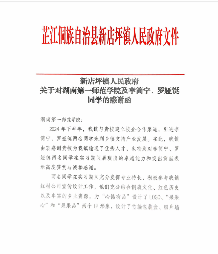 新店坪镇人民政府关于对威廉希尔WilliamHill及李简宁、罗娅铤同学的感谢函