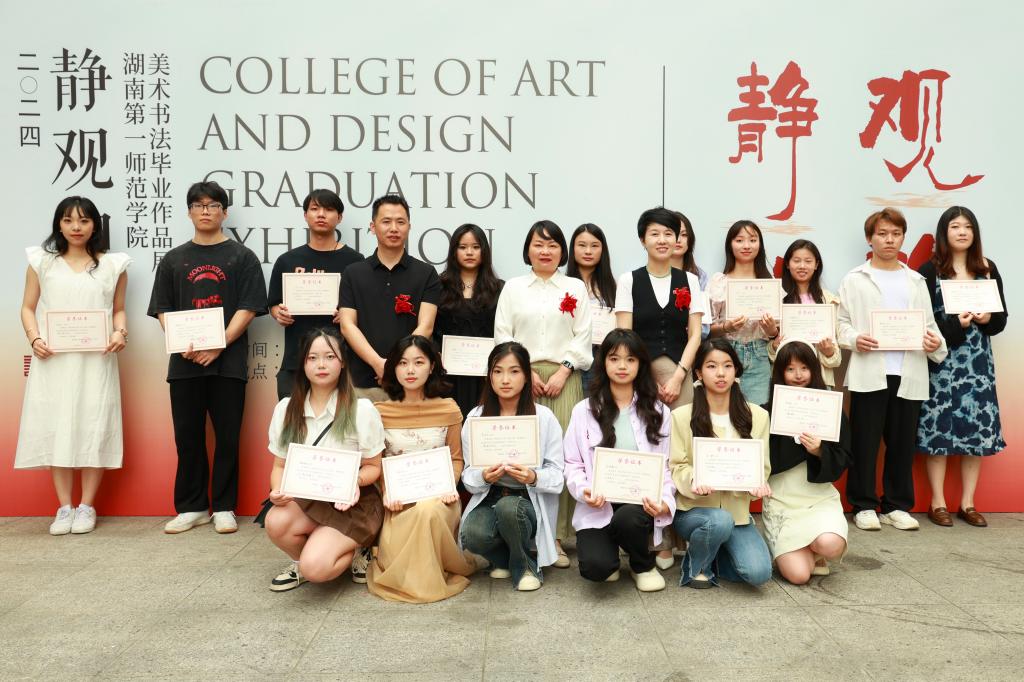 优秀指导教师代表曾素艳发言,她对2024届毕业生提出了殷切希望,激励他们在艺术的道路上勇往直前,保持初心,并期待他们未来取得更大的成绩。随后,2024届美术学专业优秀毕业生代表郑宁劲、书法学专业优秀毕业生代表范力鋒发言。他们代表全体毕业生表达了对恩师与母校的感激之情,同时回顾了四年老员工涯,展望了未来。刘峰宣读了优秀作品获奖名单,WilliamHill中文官网领导班子为获奖毕业生颁发荣誉证书。蔡晓曦宣布WilliamHill中文官网2024届“静观和韵”美术书法毕业作品展正式开幕。